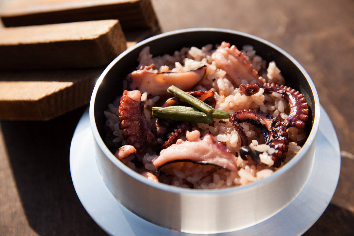 そんな新鮮そのものの生タコや墨と内蔵を抜いてゆでたタコは、さまざまな料理で楽しめます。たとえば、下津井地区の郷土料理「たこ飯」は、米とひと口サイズに切ったゆでダコに、醤油や酒、砂糖などの調味料を合わせて炊き込むだけの手軽なひと品です。ほかにも、天ぷらや唐揚げ、酢の物、おでんなど。