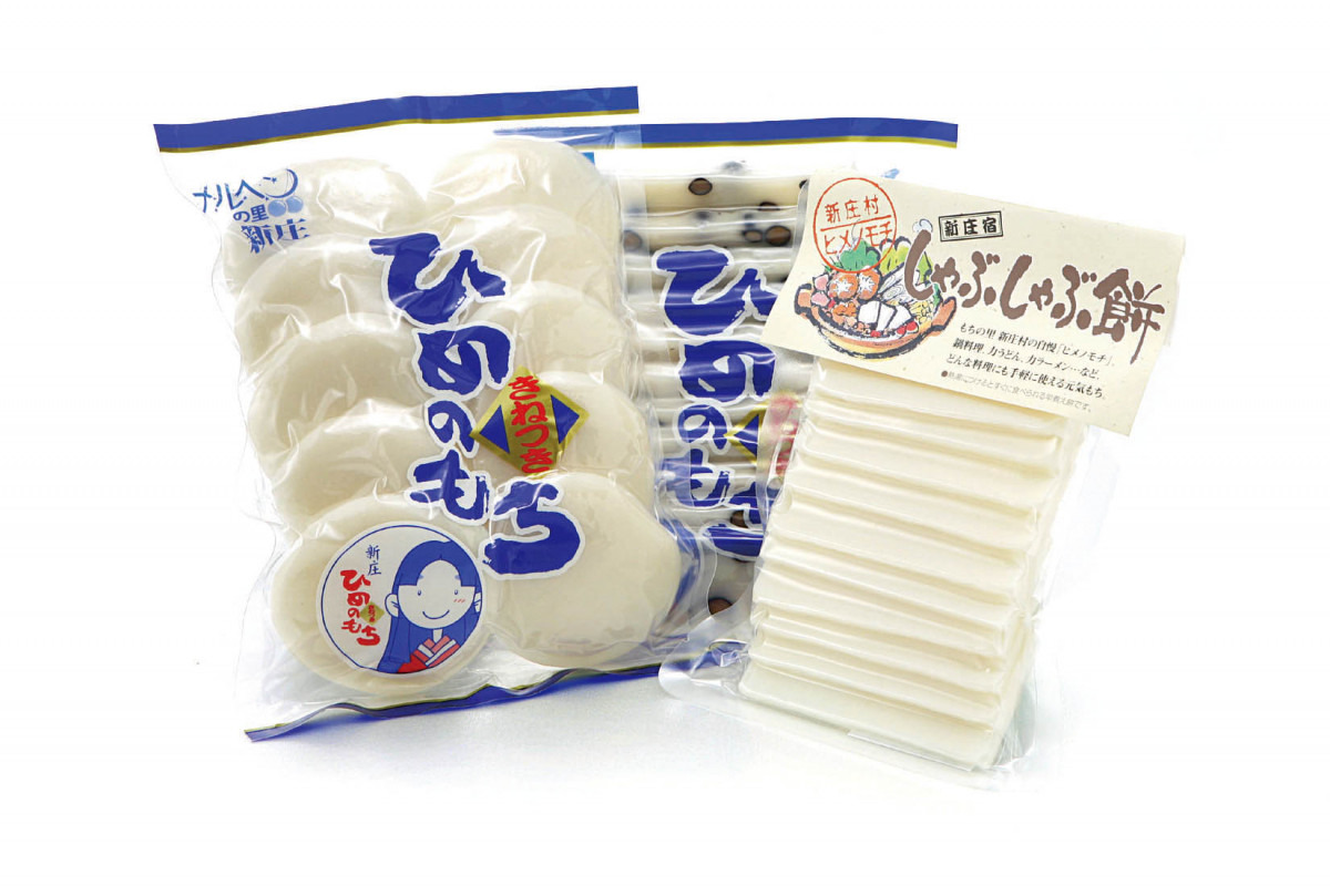 昼夜の寒暖差の大きさ、水源の森百選 に認定されている「毛無山」のブナの原生林から流れ出る清涼な水、有機堆肥を投入した肥沃な土。餅米づくりに適した新庄村で、農家が丹精込めて育てる餅米の最高品種「ヒメノモチ」。それを100%使用した杵つき餅の「ひめのもち」は、白さとキメの細かさ、粘り、そして甘みに秀でた自慢の品です。