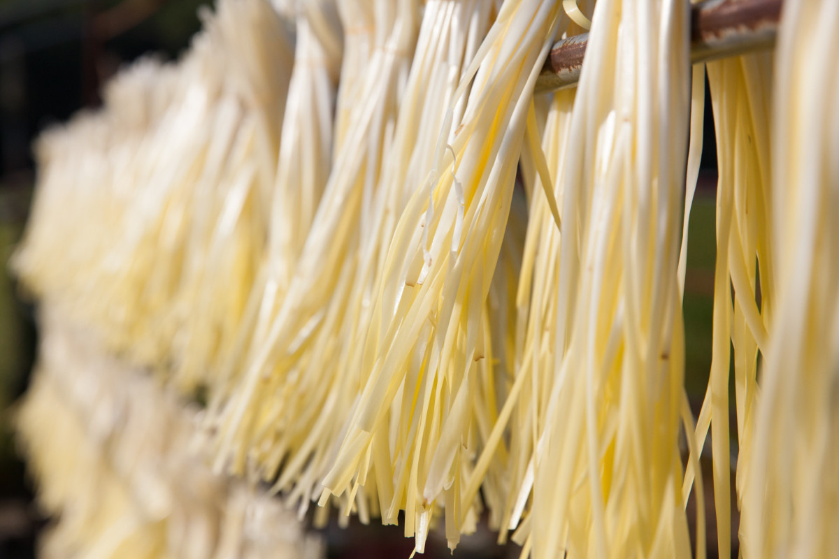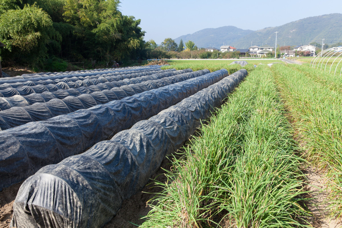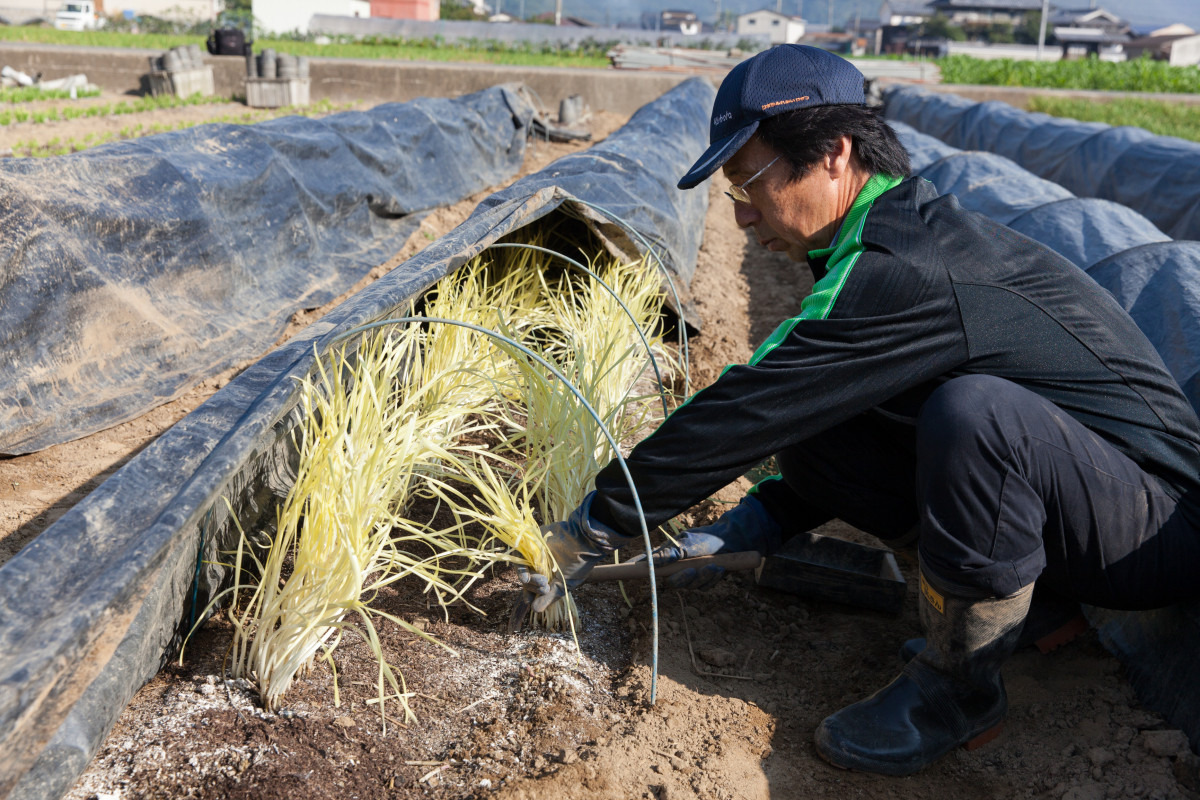「黄ニラと緑色の青ニラは、実は同じものなんです」と教えてくれたのは、牧石地区で栽培を行っている黄ニラ部会部会長の伏見さん。ニラには緑の色素と黄色い色素があり、光合成によって緑の色素が増え、全体が緑色になるのだといます。そのため、特殊な黒いシートで太陽光を遮断する「遮光栽培」という独特の方法で、光合成させないようニラを栽培。