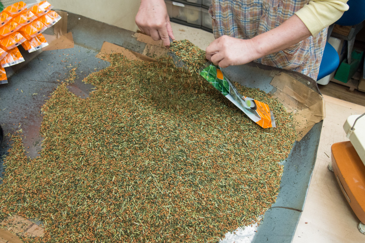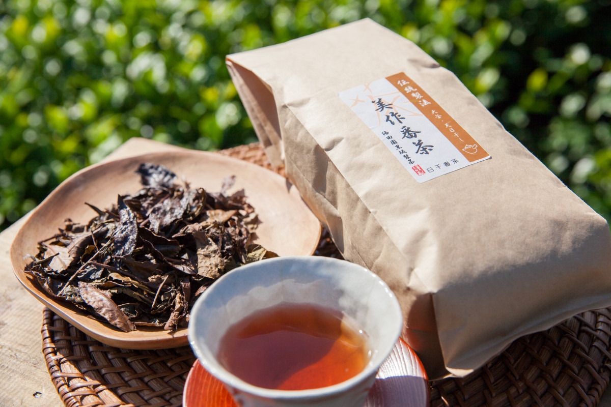 岡山県の北東部に位置する美作市海田地区とその周辺で、古くから作られてきた日干番茶。天日干し番茶とも言われるこのお茶は、一番茶を摘んだ後に伸びた枝葉を大釜で煮て、むしろに広げて天日干しにするもので、途中、乾き具合を確かめながら、釜の煮汁を幾度か回しかけ、飴色に輝く茶葉に仕上げます。