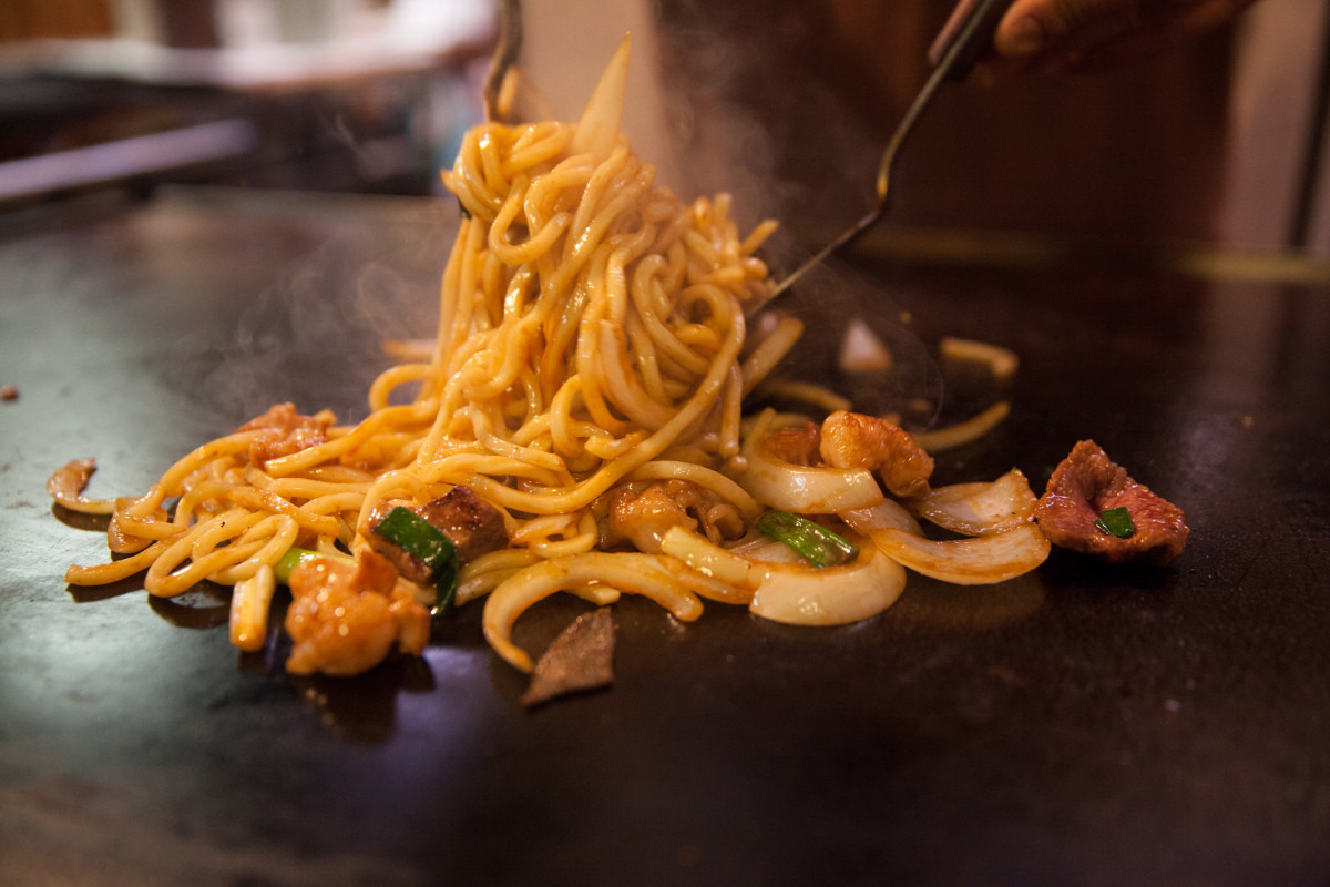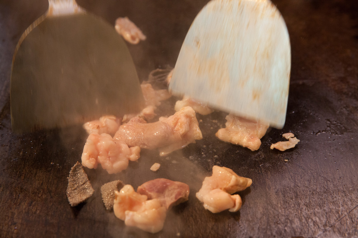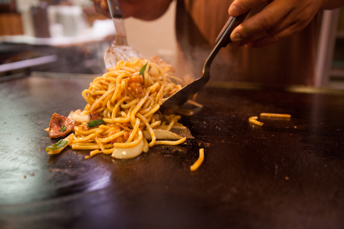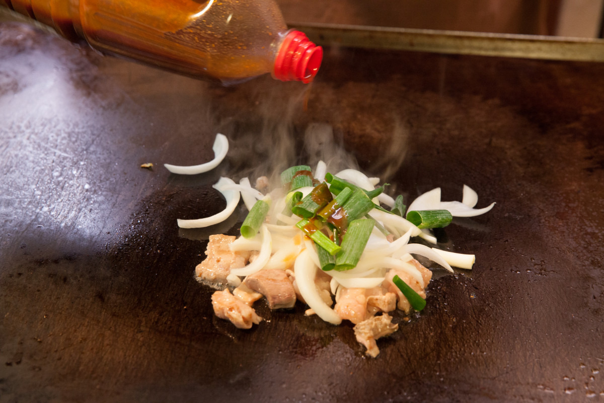 熱した鉄板上で、コテを使って一口サイズに切りながら焼いたホルモンに、野菜を加えてさっと炒め、その隣で温めていたうどんを乗せて、秘伝のタレをひと回し。全体を混ぜ合わせながら炒め、香り付けにタレを加えたら完成。ジュージューと食欲をそそる音とともに立ち上る湯気と香りが、期待感を高めます。