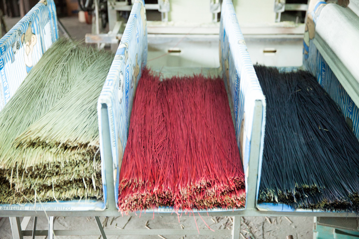 イ草を畳表やござなどに加工する際には、色合いのむらをなくして輝きを高め、劣化を抑制し、丈夫にするための「泥染め」が施されます。乾燥機がなかった時代には、「泥染め」したイ草を天日干しによって乾燥させていたため、雨の少ないこの地では、イ草の栽培とともにその製品化が発達してきたのです。