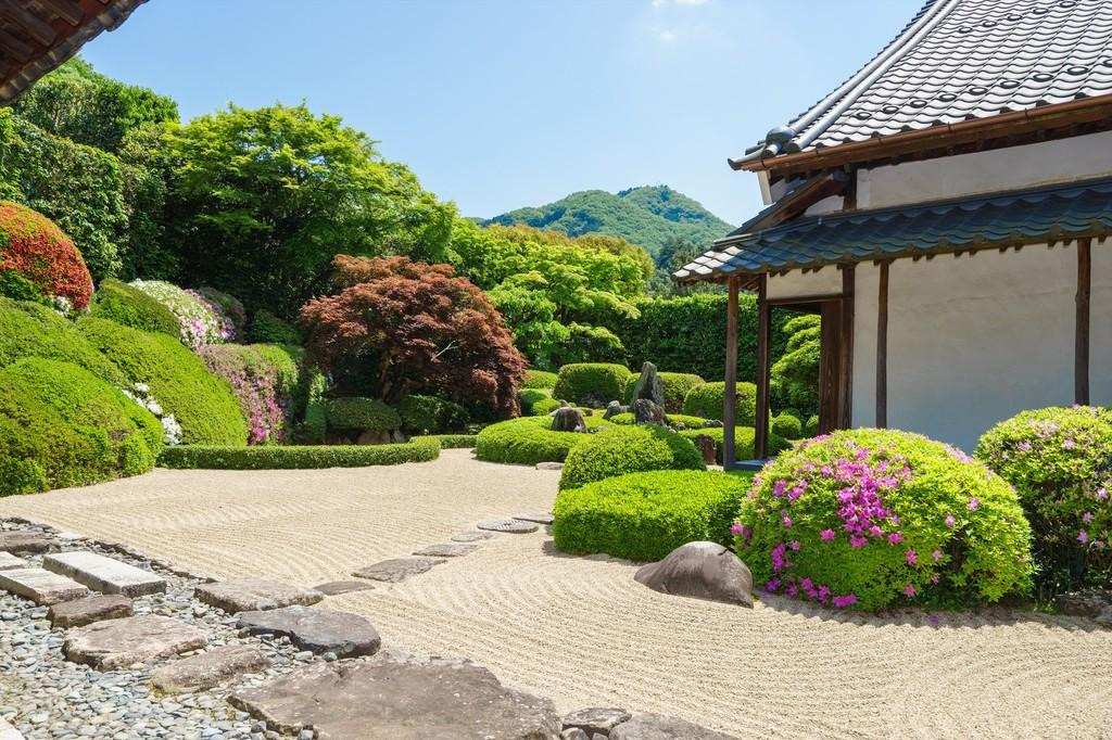 鎌倉時代に足利尊氏が諸国に命じて建立させた安国寺のひとつ。備中国奉行として赴任してきた小堀遠州(こぼり えんしゅう)によって築庭された枯山水庭園は見事です。愛宕山(あたごやま)を借景にしてサツキ、ツツジの花々と、鶴島、亀島の石組みを配置した景観は訪れた人の心を癒します。庭園は国の名勝に指定されています。