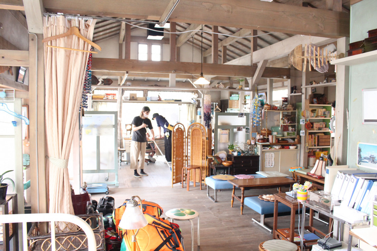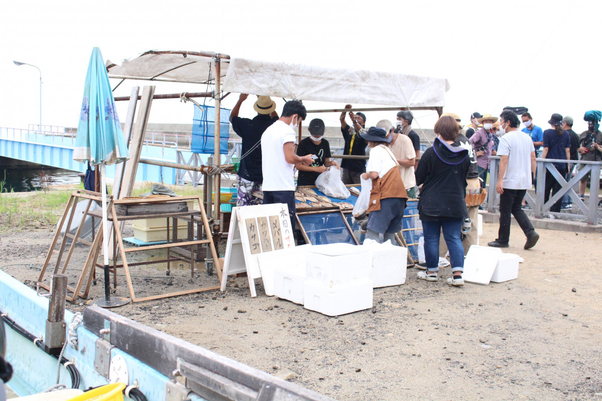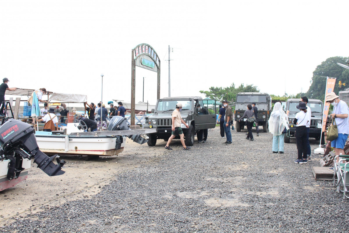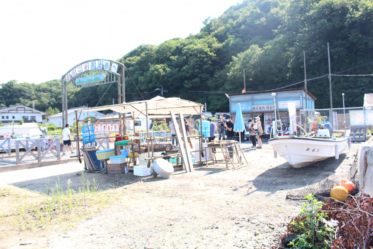 - 更地に待合所や干物売り場、看板などを建てフェリー乗り場の様子を作り上げました。フェリー乗り場の装飾に島の漁師さんの船などもお借りしました。