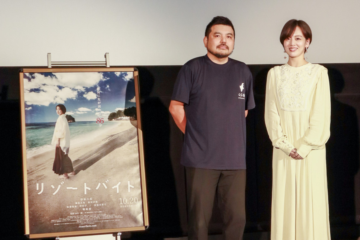 2023年10月22日(日)に、主演の伊原六花さん、藤原大祐さん、永江二朗監督の3名が凱旋登壇し、イオンシネマ岡山で公開記念舞台挨拶が行われました。この日のMCは、劇中で伊原さん演じる桜たちがリゾートバイトで訪れた旅館の主人役・坪内守さんが担当。撮影時を振り返りながら、作品の魅力と併せてロケ地である白石島の魅力も語ってくれました。イベント終盤には劇中に島民役で出演した伊原木隆太岡山県知事がサプライズ登壇し、代表して伊原さんに岡山の特産品であるシャインマスカット「晴王(はれおう)」をお渡ししました。ロケ地である岡山から全国に「リゾートバイト」旋風が巻き起こることを期待して、次なる舞台挨拶のステージである大阪に旅立たれました!