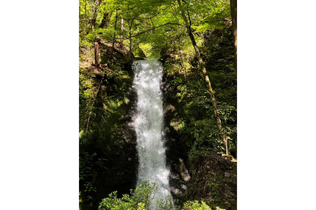 戦国時代の武将・延原弾正の屋敷跡があった場所とされ、「屋敷の滝」と呼ばれています。深い緑に囲まれた馬桑川の源流にある滝は、高さ約40m。水量豊かで清らかな水は周囲の原生林にも映えています。