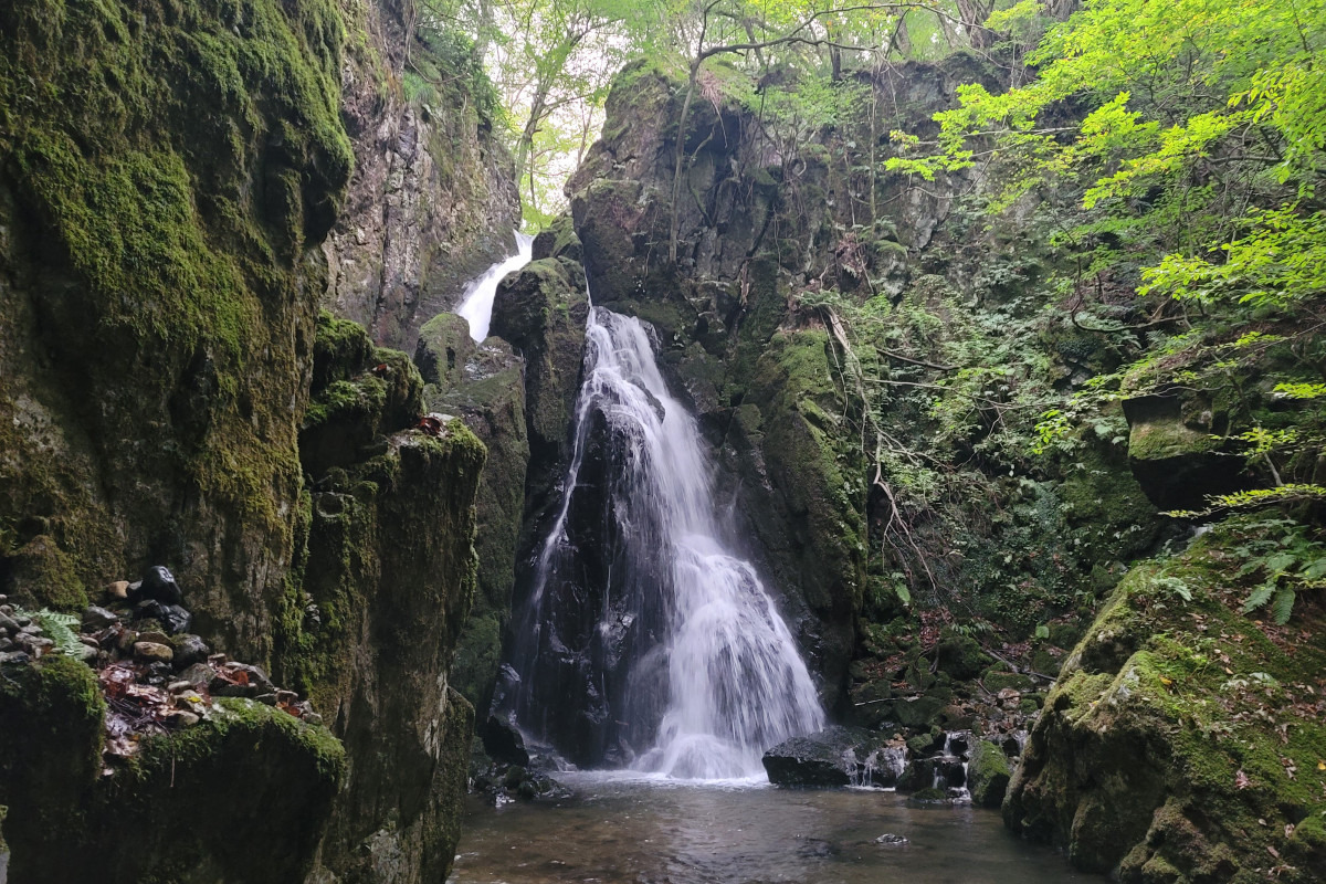 深い天然林の先にある男滝と女滝