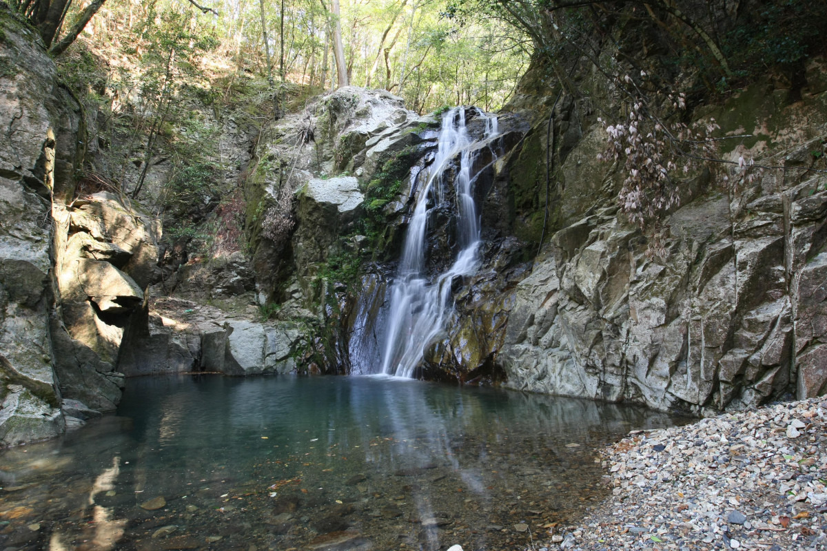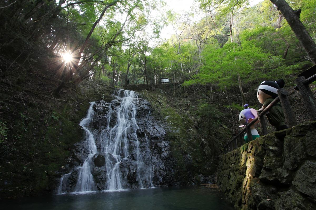 上段の滝から流れ落ちた水が、滝壷から更に下の淵に瀑布となって注ぐ二段の滝です。上の雄滝は高さ15m、下の雌滝は高さ7m。滝のそばの岩場には不動明王が祀られていて、民間信仰の場にもなっています。