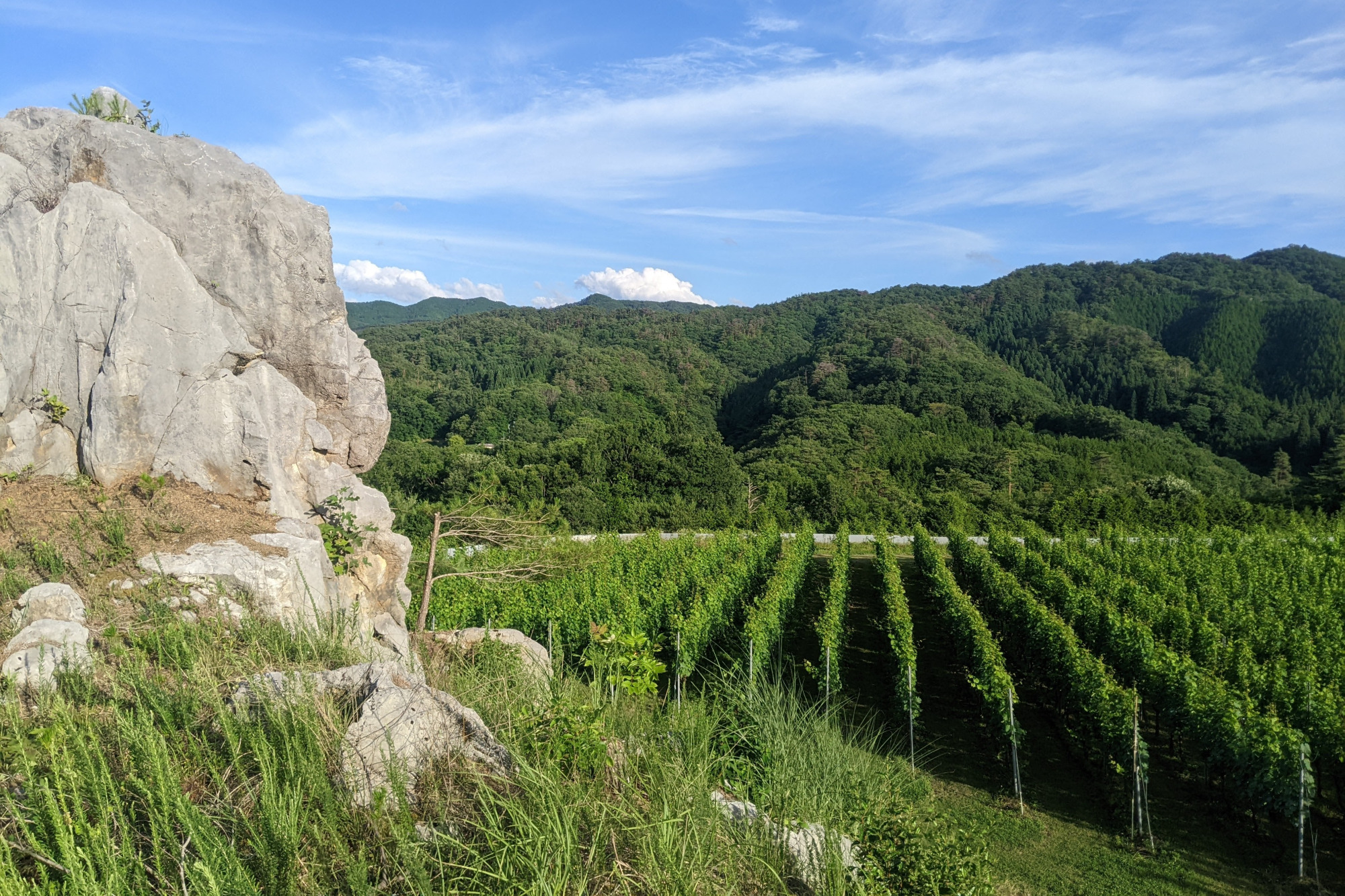 岡山県新見市、標高約400mの石灰岩土壌に広がる畑で、栽培から醸造、瓶詰めまで一貫して行うワイナリー。