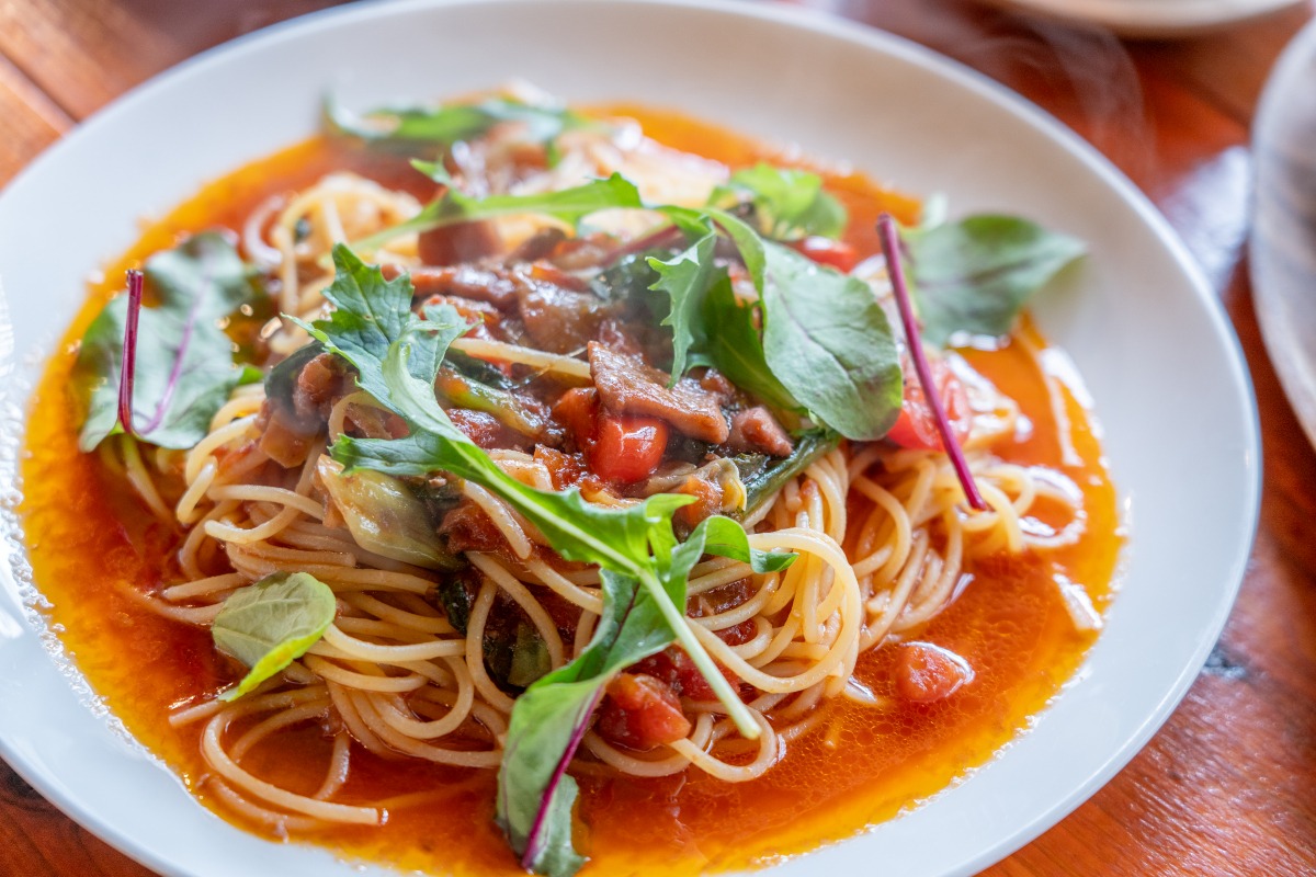 築60年以上の日本家屋で営まれる、パスタとピザが人気のカフェ。旨み凝縮のトマトソース、グラナ・パダーノたっぷりのクリームソース、素材の味を堪能できるオイルベースのほか、地元産の味噌や甘酒を使った和風ソースなど約15種類のパスタが楽しめます。またピザはモチモチ生地のナポリ風で定番の7種に加え季節のフルーツを使ったスイーツ系までバラエティ豊か。子ども連れに嬉しい個室にできる座敷や、藤棚の下のテラス席もあります。