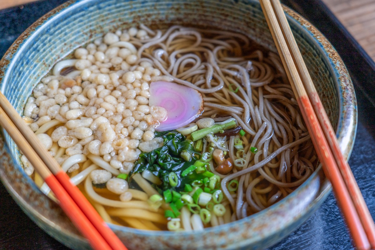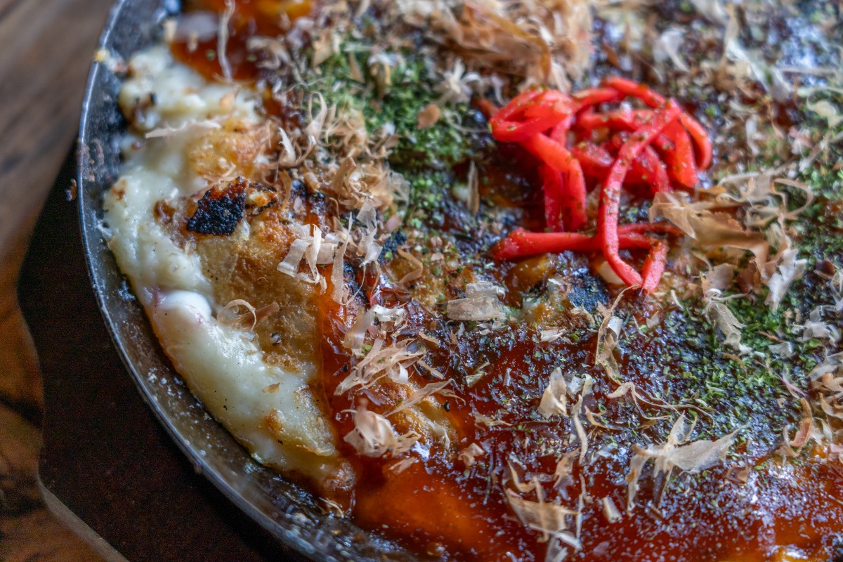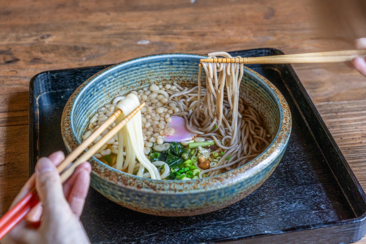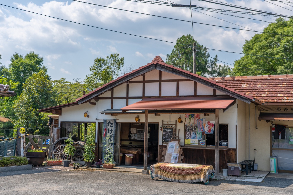 美作国宮本村(現美作市宮本)生まれの剣豪・宮本武蔵の生家跡の目の前にある茶屋。名物は太刀と刀を両手で持つ二刀流にちなんだ、うどんとそばが一つの器に入った「武蔵二刀流麺」。添えられた長短2膳の箸を左右の手でそれぞれ持って食べる、ユニークな演出のメニューです。もう一つの名物は「又八焼き」は山芋がたっぷり入ったお好み焼き。ふわふわとろとろの食感がクセになります。ここでしか食べられない武蔵リスペクトメニューは、国内だけでなく武蔵ゆかりの地を訪れる海外からのファンにも好評です。