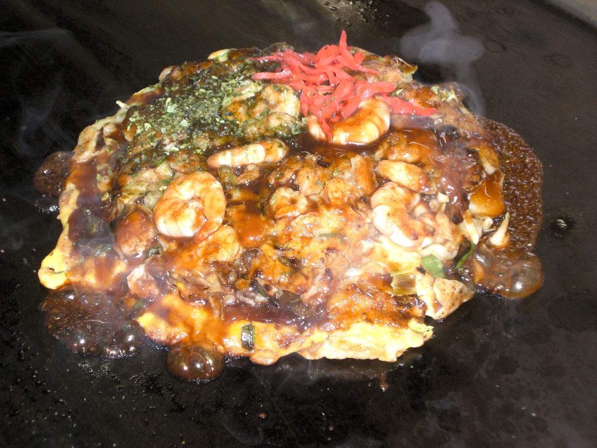 備前市日生町のお好み焼きといえば冬季はカキオコ、そして夏季はこのエビオコが定番です。「有名なカキオコよりもこちらの方が好き」という方も多く、根強い人気を誇っています。