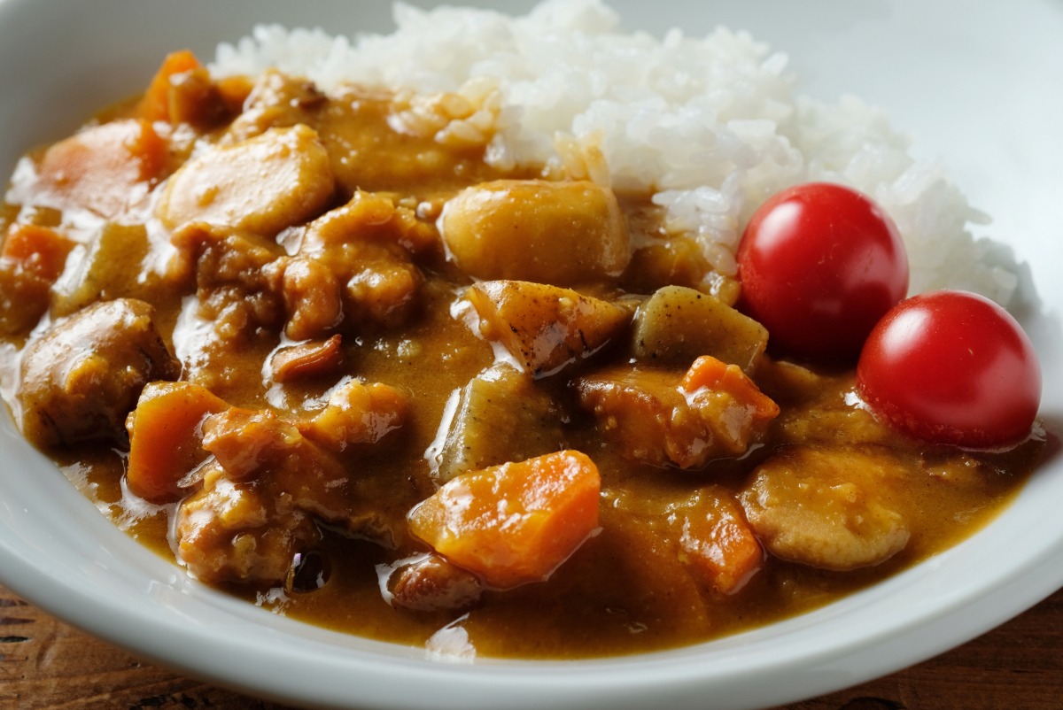 大ぶりな鶏肉やジャガイモ、こんにゃくなど地元特産の具材がごろっと入り、ミニトマトがトッピングされたカレーです。隠し味の味噌がコクを増しています。