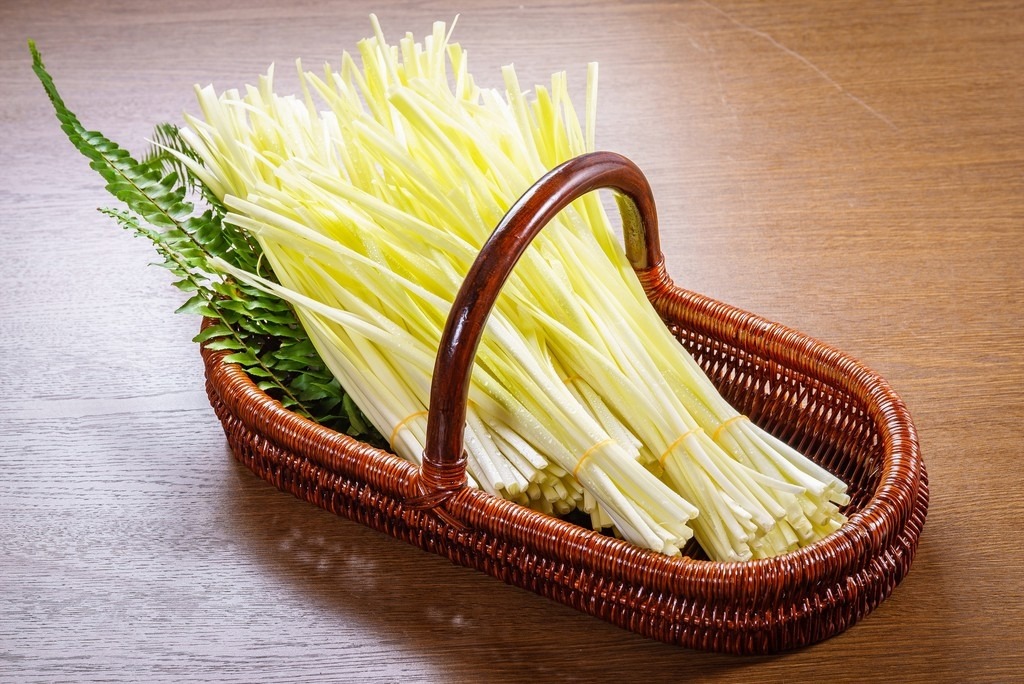岡山県三大河川のひとつ、旭川下流の砂地で光を遮って栽培しています。シャキシャキとした歯ごたえ、ほんのりとした甘味。気品ある香りと優しい黄色が料理を引き立てます。