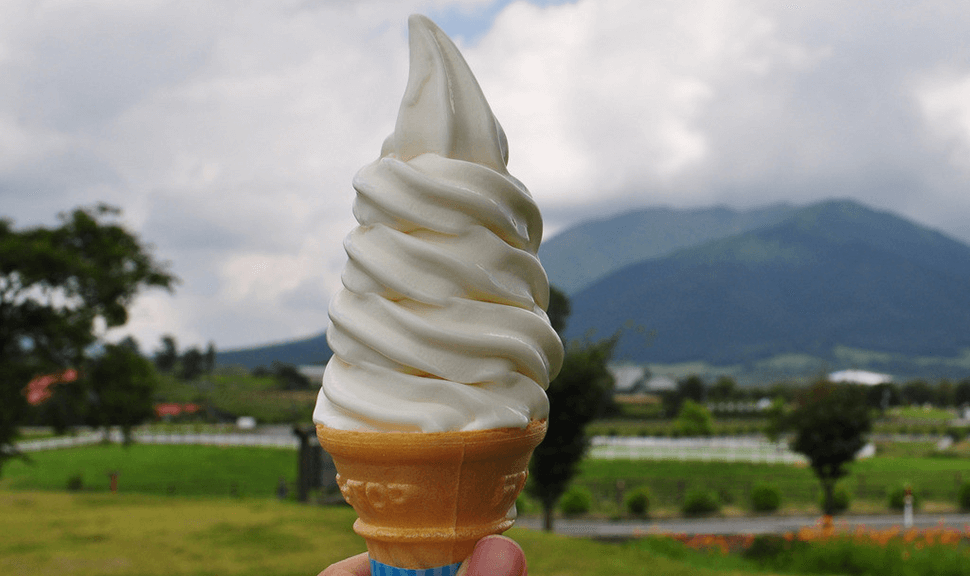 蒜山高原ではジャージー牛乳を使用した濃厚なソフトクリームが色々なところで食べられる。すこし黄みがかった特徴的な色は、おいしさの決め手となる乳脂肪分がたっぷり含まれている証拠。特別な機械で作る濃厚さが自慢。