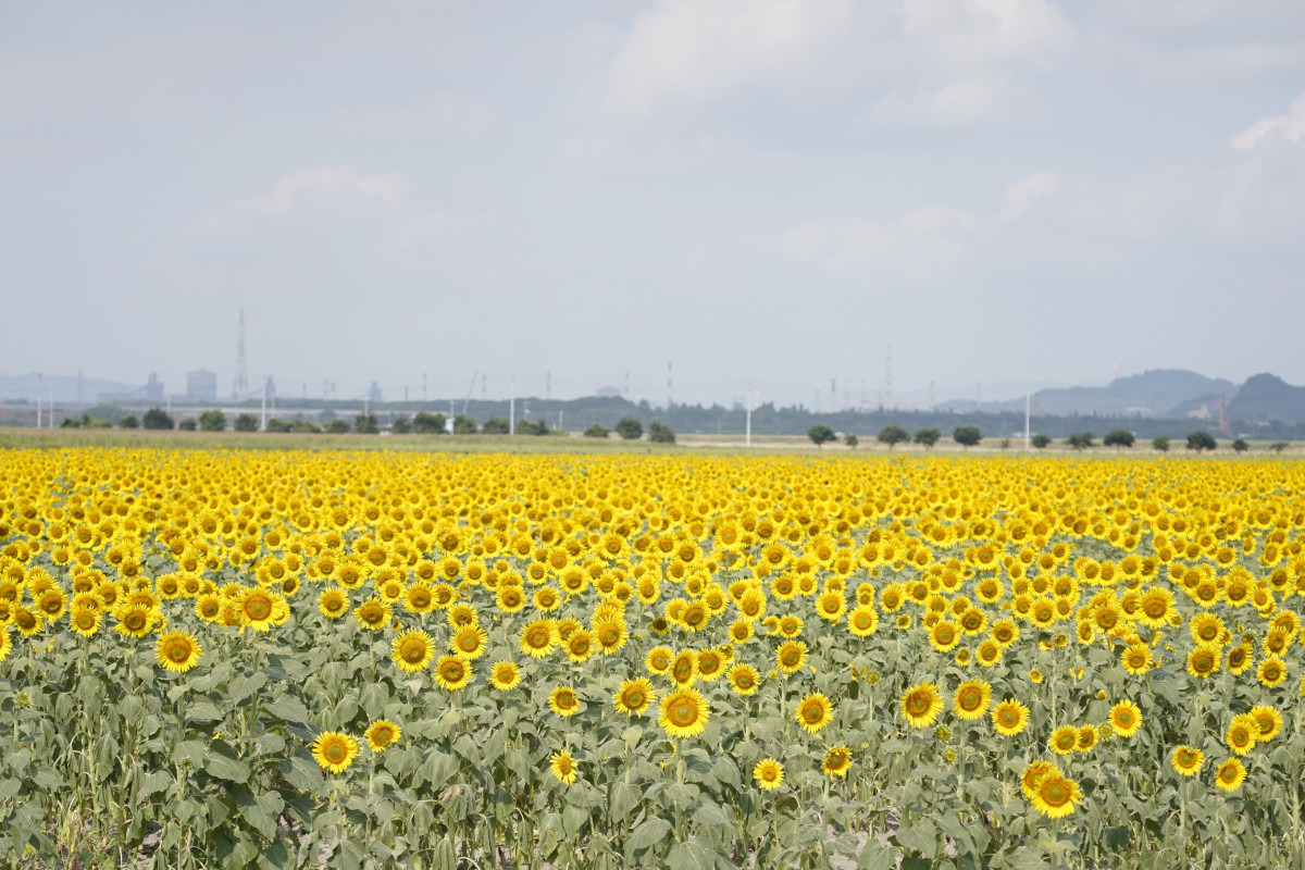 笠岡湾干拓地内の道の駅に隣接した花畑に咲き誇るひまわりの数は、なんと約100万本! 数ヵ所の畑で時期をずらして開花するようにしているため、長い期間開花を楽しむことができます。展望台やフォトスポットもあり、県内外から多くの人が訪れています。