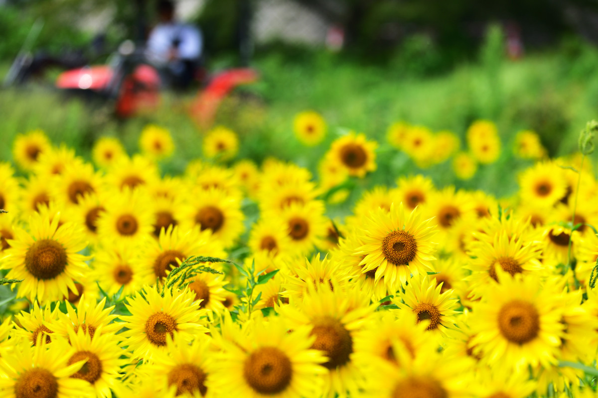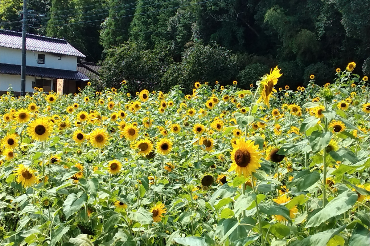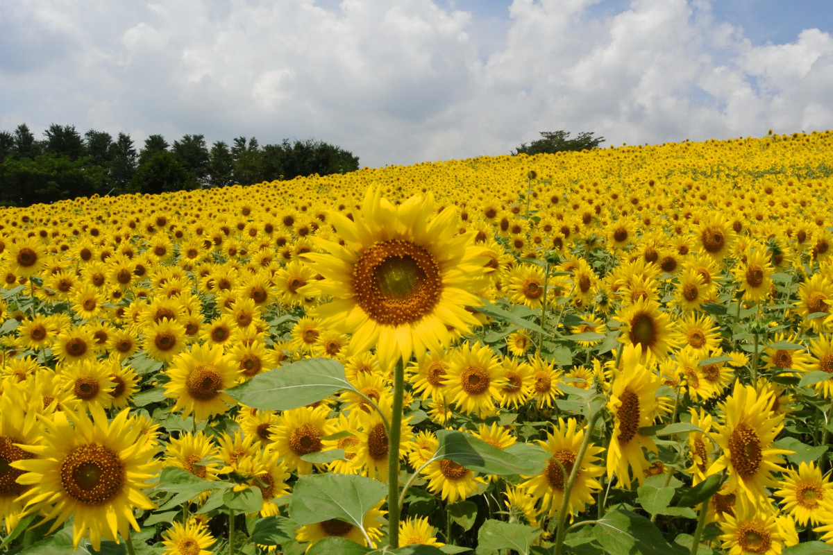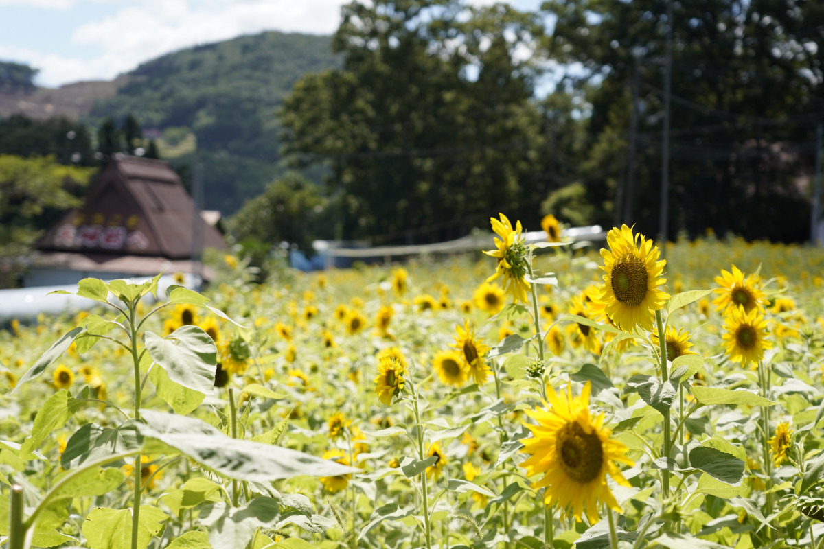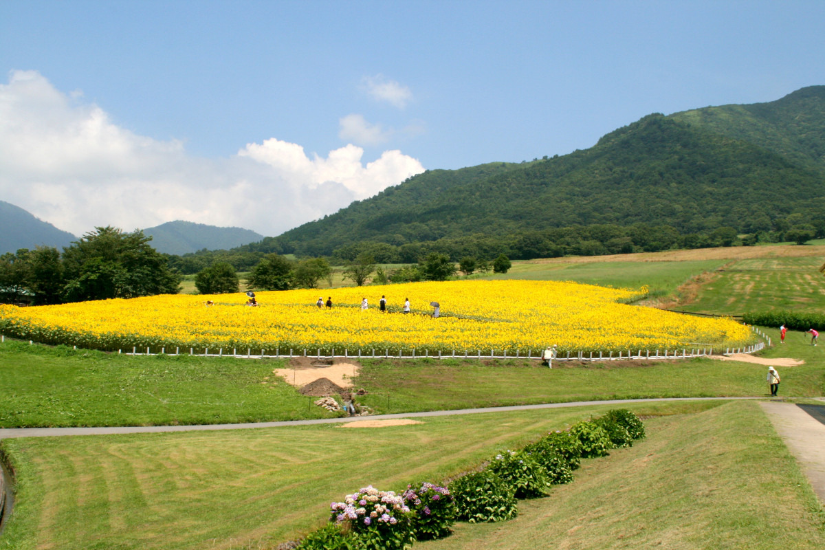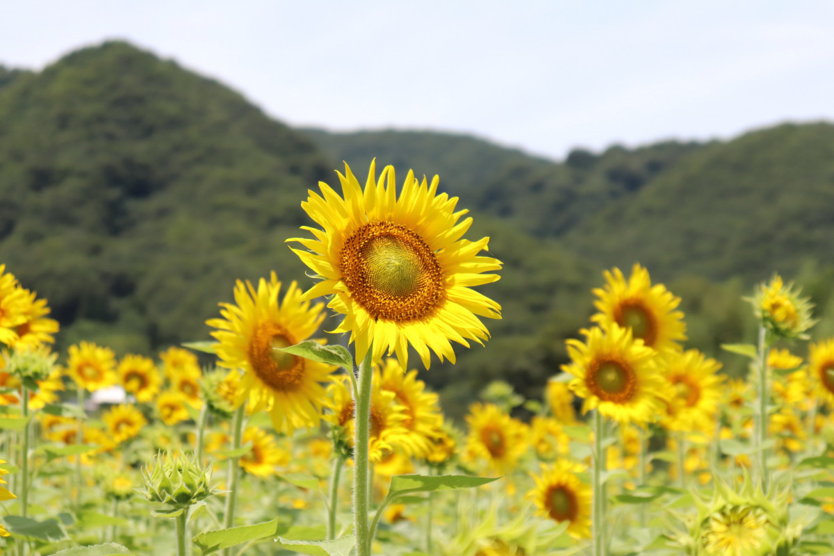 開花時期は県内では少し遅めのひまわり畑で、毎年8月中旬頃に見頃を迎えます。岡山自動車道・蒜山ICを降りてすぐの場所にある「道の駅風の家」に隣接しており、蒜山への来訪者を迎えています。