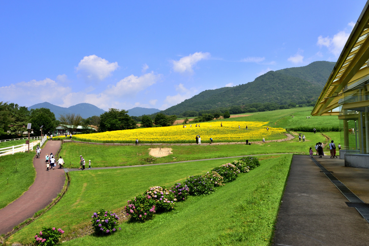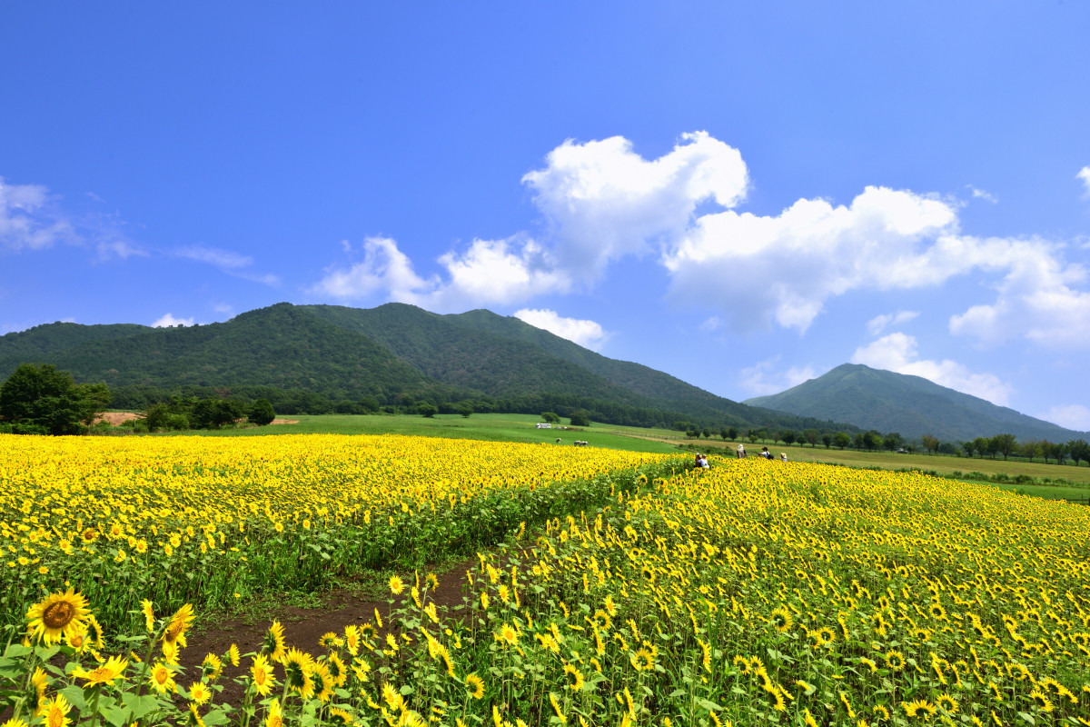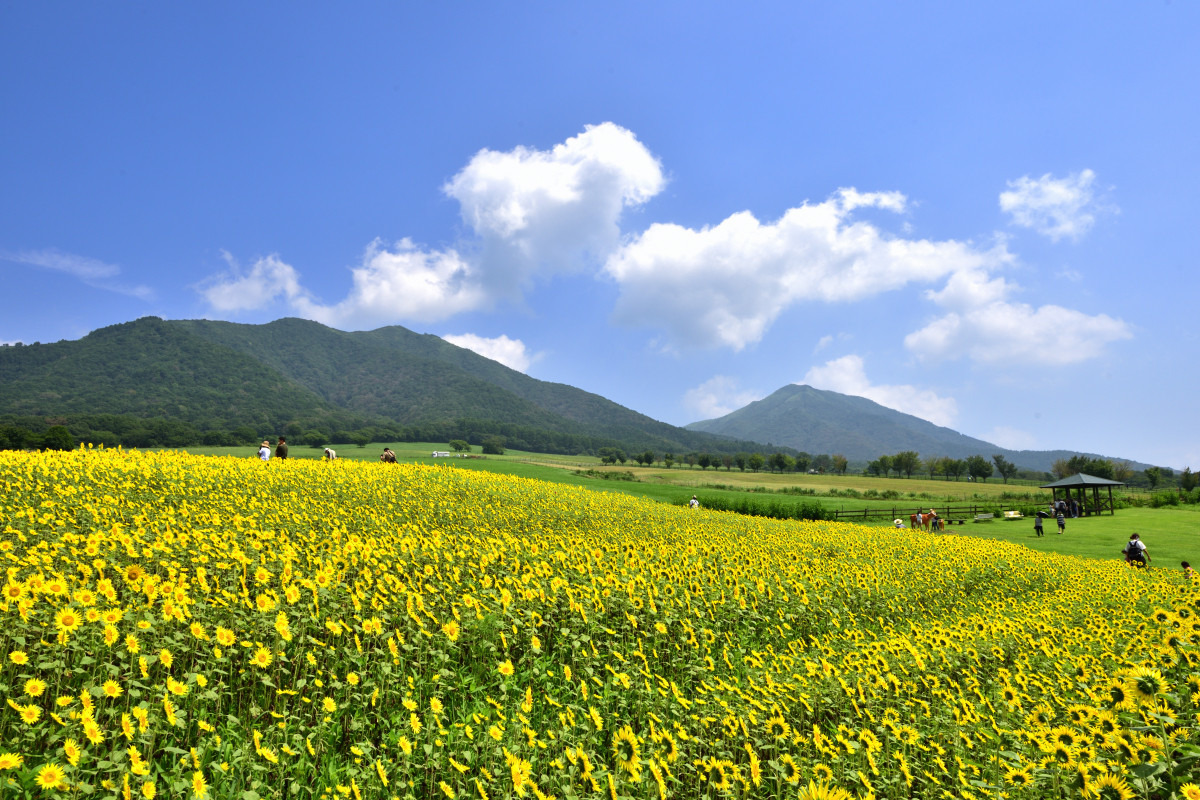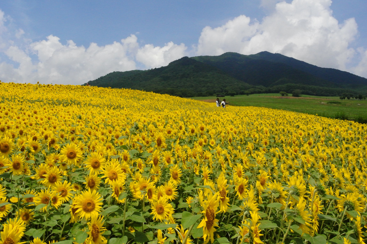 蒜山三座の雄大な姿と放牧中のジャージー牛がのんびりと草を食む様子が見られるスポットです。広大な敷地に咲き誇る約8万本のひまわりは蒜山高原の夏の風物詩。青い空や牧場の緑に映えてまるでアートのようです。
