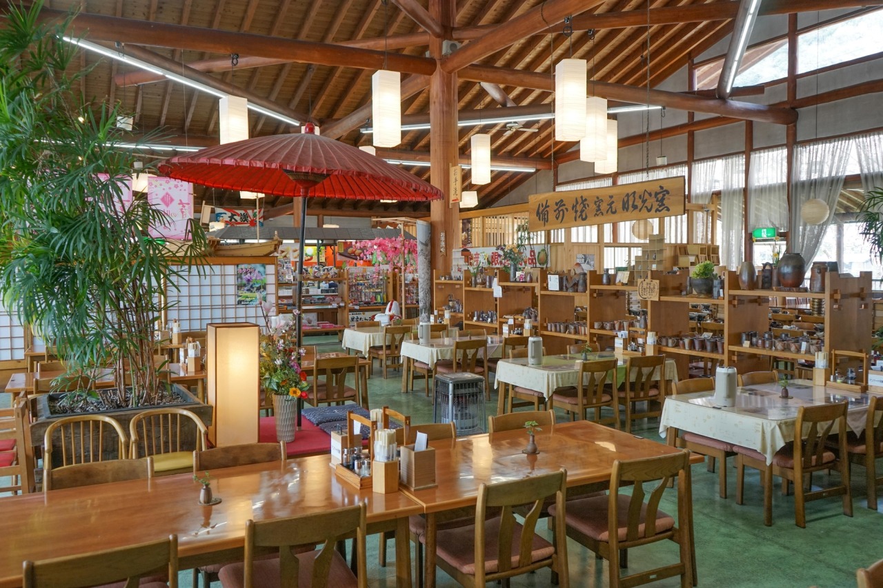 しっとりとした和風木造杉丸太造りの建物。地元の方々のお食事の場をはじめ、団体旅行の拠点として多くの方が利用されています。