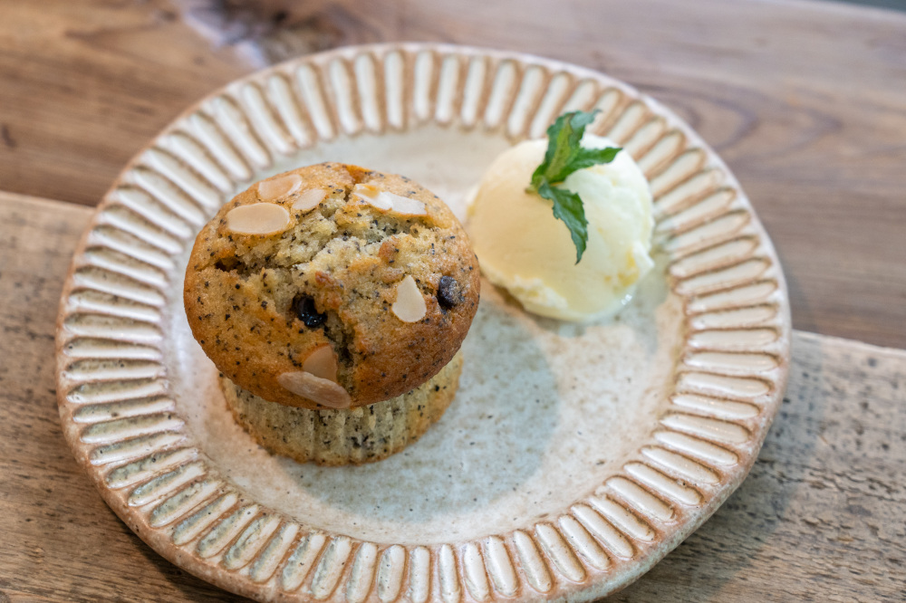 湯郷温泉街のマフィンとブランチのお店。小さな子どもから年配の方まで食べて欲しいというマフィンは、バターの代わりに米油を使っているため驚くほど軽い食感。津山産小麦ふくほのかに塩麹とヨーグルトを加え、コクのある味わいに仕上げられています。ショーケースに並ぶのは、美作市内にある「さとみ農園」のこだわり自然卵の風味が生きたプレーンマフィンをはじめ、チョコチップや黒豆ばななきなこ、旬の野菜やくだものを取り入れたものなど10~12種類。イートインの場合はアイスクリームを添えて提供されます。ブランチメニューの、たまごサンドやからあげサンド、エビフライ付きのクロワッサンも人気。テイクアウトも可能です。