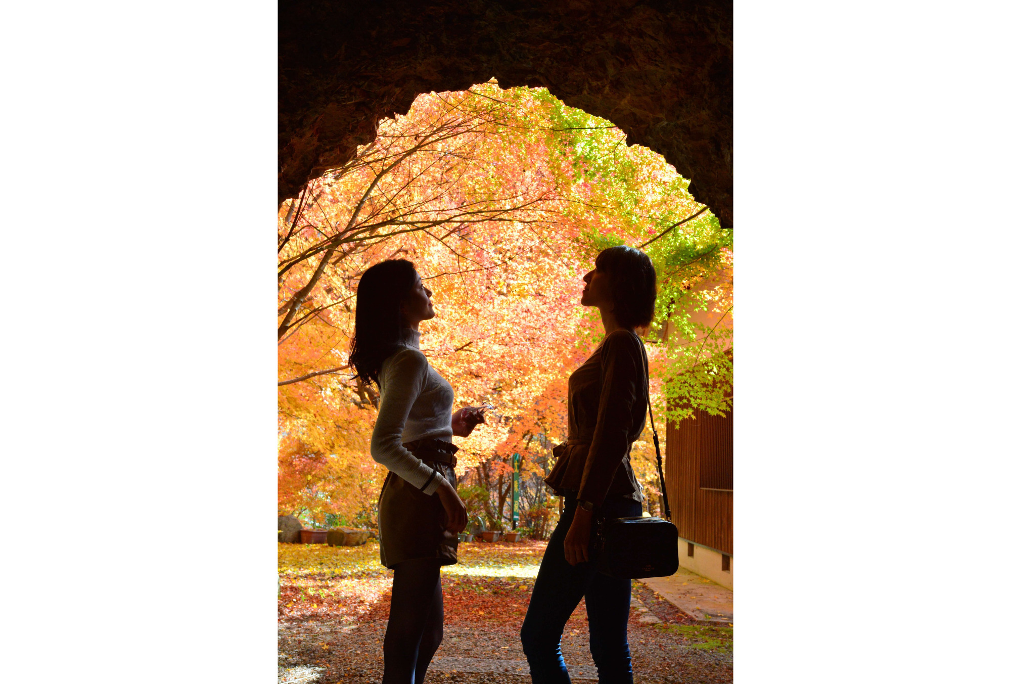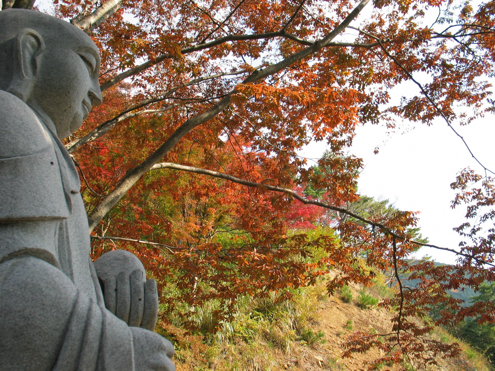 句碑の並ぶ道を散策しながら参拝できる、通称「もみじ寺」。境内を彩るもみじの紅葉風景に心を打たれます。階段を下りると岩肌がそのまま残る手彫りの文殊洞があり、こちらも壮観。毎年11月には「もみじ祭り」が開催され、写真や俳句コンテストなどが賑やかに行われています。