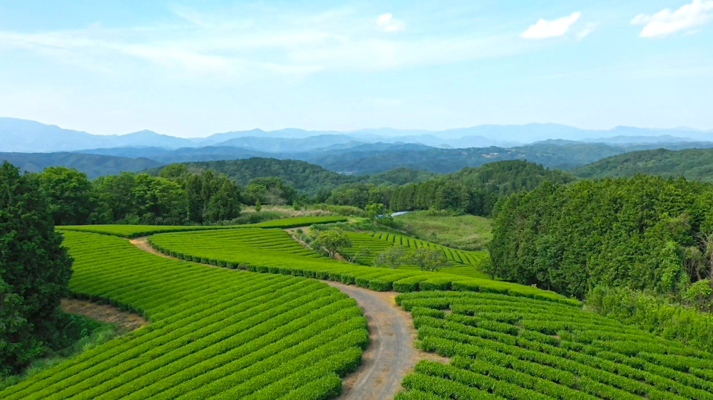 美作市を舞台にした映画「風の奏の君へ」のメインビジュアルとして使用された茶畑。ゴールデンウィークから5月中旬頃が新芽の時期で、最も色鮮やかです。予約なしで見学もOK!