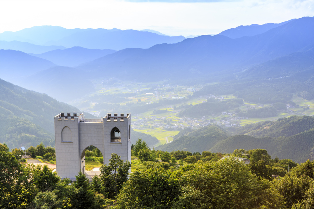 美作富士と呼ばれる日名倉山(ひなくらやま)の中腹・標高約865mに位置する自然公園。東に兵庫県の氷ノ山、西に那岐山、津山市、南に小豆島が望めるビュースポット。斜面にそびえる大きなアーチ型の鐘楼には、直径2m、重さ6tに及ぶ「リュバンベールの鐘」と名づけられたスウィングベルがかかっています。