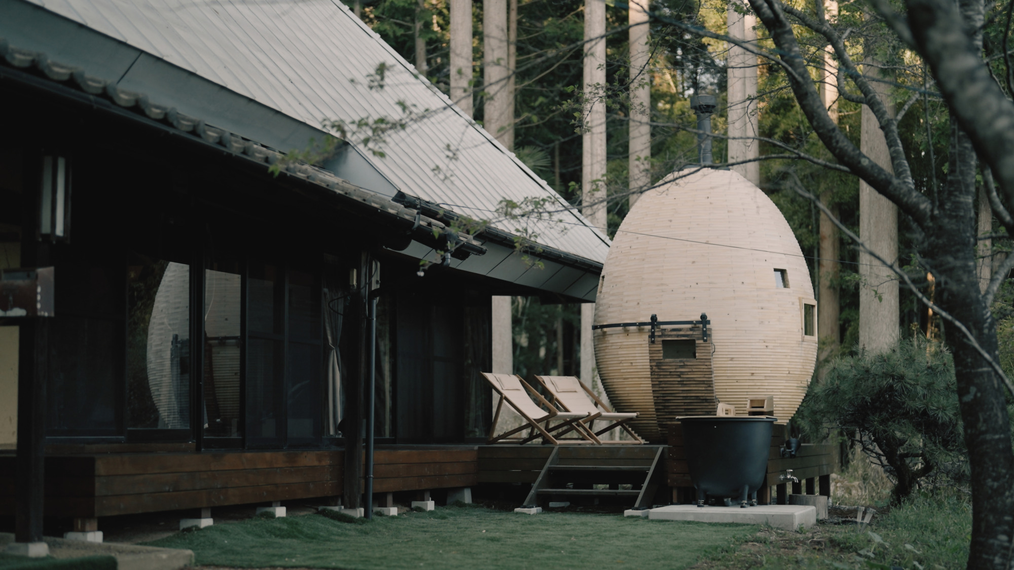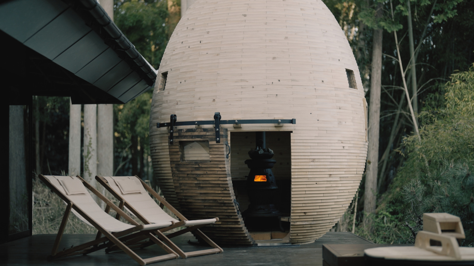 JP完全手作りの、ユニークな形が目を惹く“卵サウナ”。薪ストーブにより温めた優しい熱に包まれると、しっかりと汗が噴き出します。サウナ内はサークル型になっているので、利用者同士で会話も弾みます。(完全貸切、水着着用)