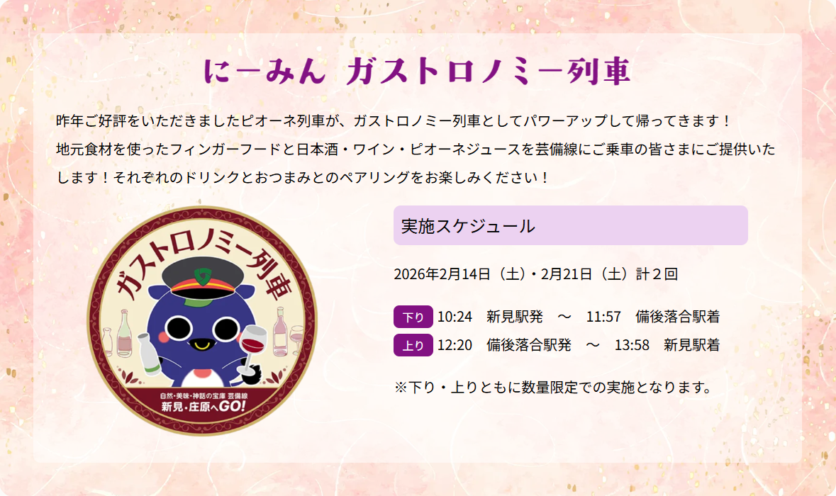 芸備線でイベント列車「ガストロノミー列車」を運行!(2/14、21)