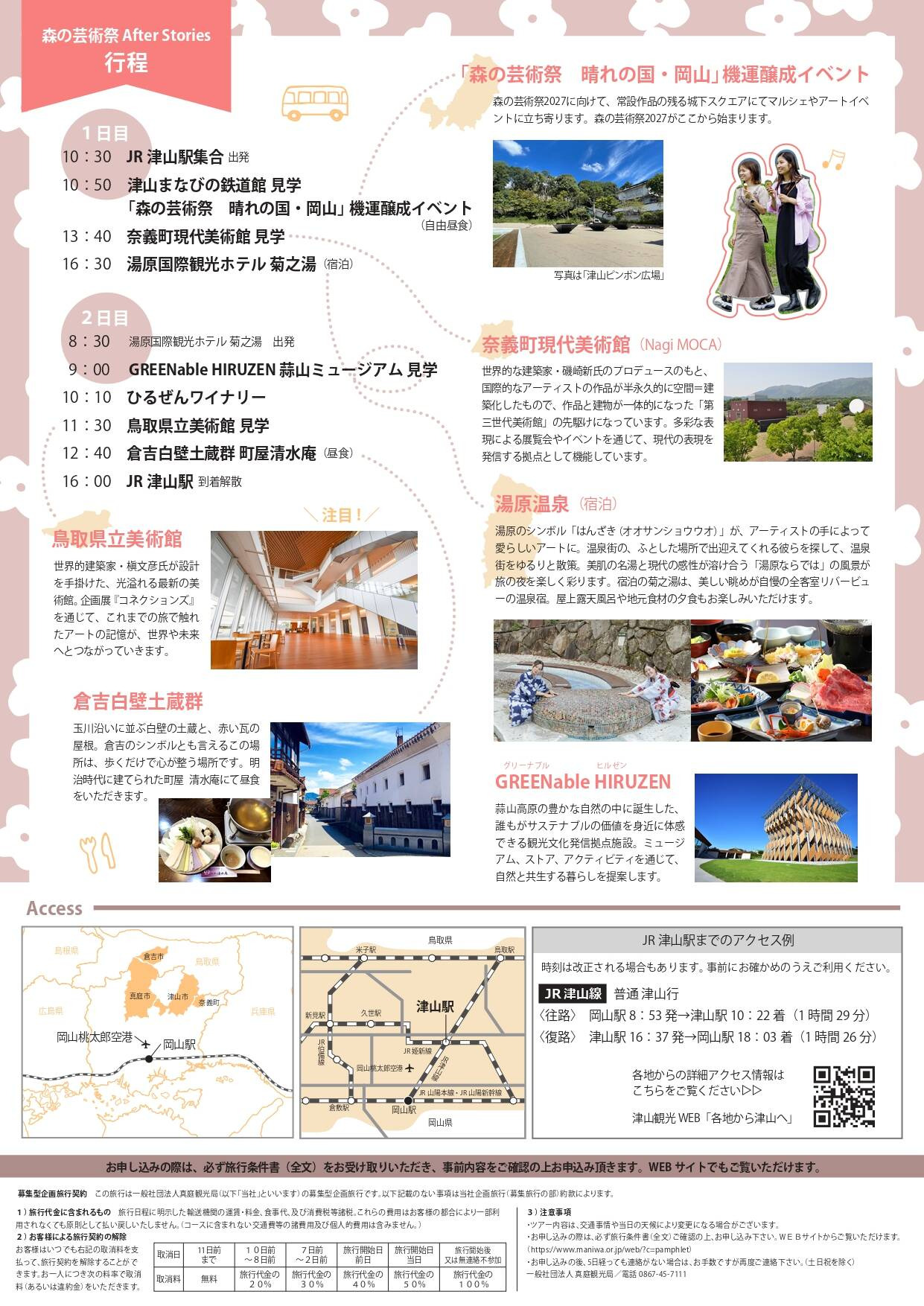 「森の芸術祭 晴の国・岡山」の余韻が残る真庭・津山・奈義、 さらに県境を越えて「鳥取県立美術館」へと足を延ばすツアーが開催されます。アートの足跡を辿りながら、新しい美しさに出会う特別な2日間です。