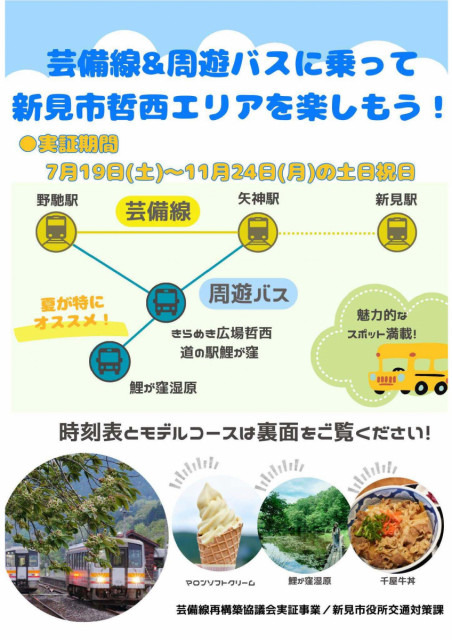 2025年7月19日(土)~11月24日(月・祝)の土・日・祝日に、芸備線の増便、二次交通(周遊バス、乗合タクシー)の運行を行うほか、観光商品の提供や道の駅周辺のにぎわい創出なども実施することとしています。