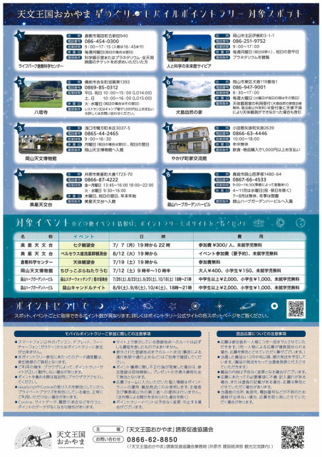 岡山県内にある天文に関連した各施設を利用、または天文に関する各種イベントに参加する事で、ポイントを獲得できる「星めぐりモバイルポイントラリー」が開催されます。その獲得数により、オリジナルマスキングテープや天文関連グッズのプレゼント応募することができます。