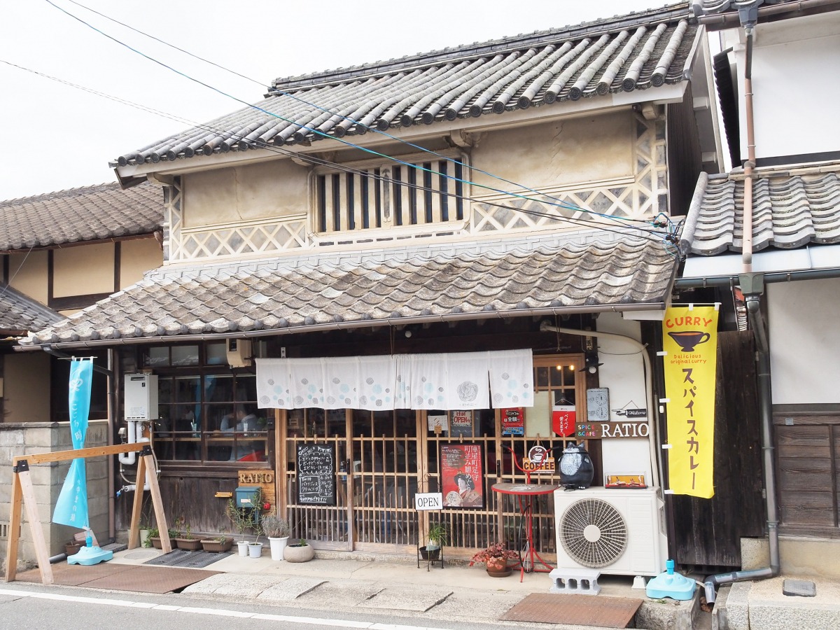 ランチ時だったので、散策中に気になった「スパイスカフェRATIO(レシオ)」に入りました。陣屋町足守駐車場の隣にあります。足守らしい古民家に「スパイスカレー」ののぼりが。
