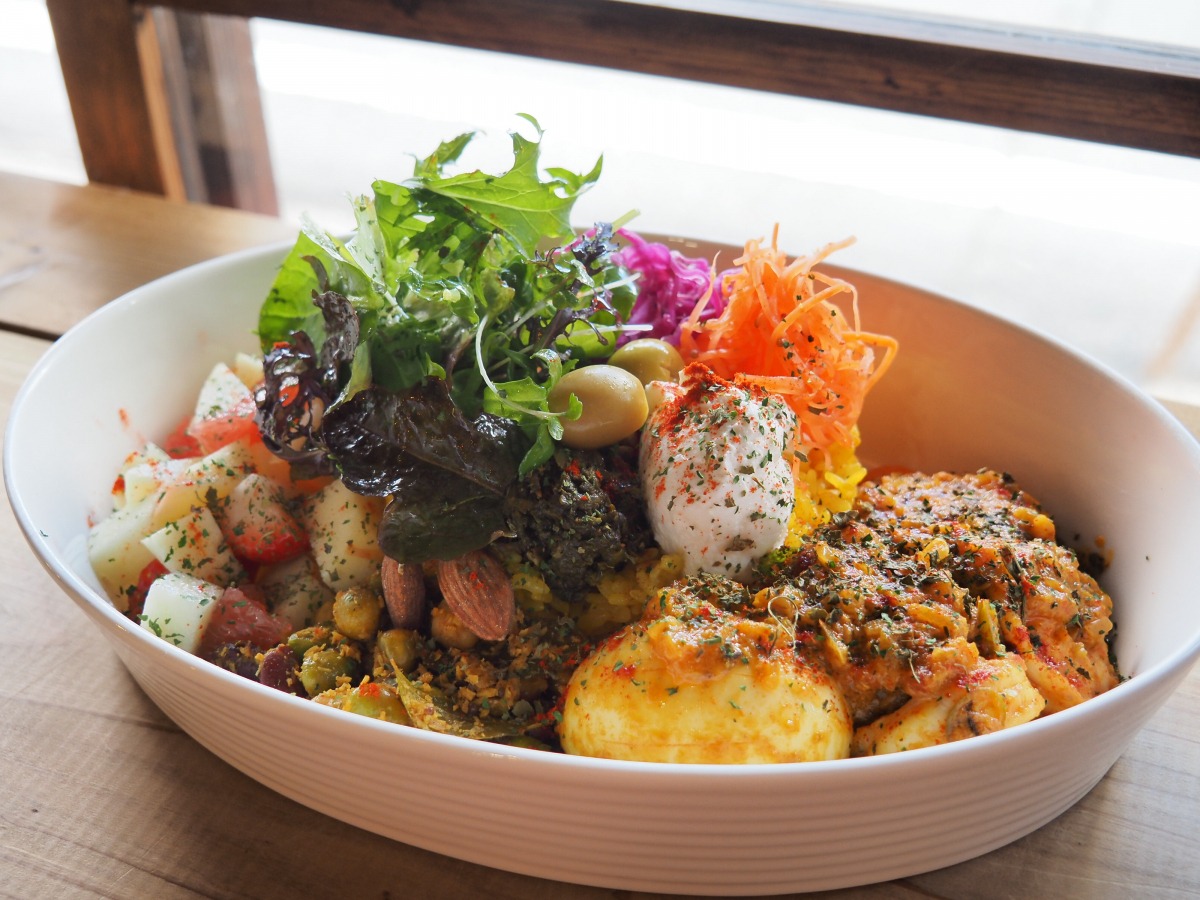 プリプリの海老が入ったキーマカレー、サラダ、ゆでたまご、水切りヨーグルト、ナッツ、果物などがワンプレートになって、様々な味わいが楽しめるひと品です。