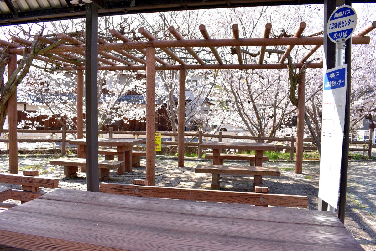 なんとバス停にまでも満開の桜が!ベンチが沢山あるので、お花見しながら休憩できちゃいますよ。「人も翼をつければ空を飛べる」と考えた八浜の偉人・櫻屋(浮田)幸吉の、生誕の地の碑もすぐ横です。元川にかかる石造りの2本橋をながめたら、漁港の面影のこる児島湖にも足をのばしましょうか。