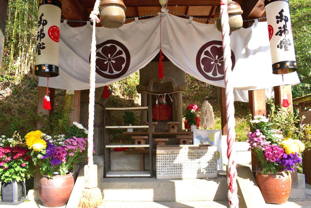 「与太郎さま」と慕われている与太郎神社。溢れるように供えられた花々からも、信仰の深さが伝わります。足を負傷したことから、討ち取られてしまった児島八浜合戦の総大将・宇喜多与太郎基家。その供養のために村人が建てたという神社です。足腰の病にご利益があるんですって。