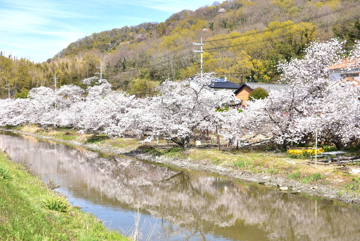 県道405号線に沿うように流れる天神川。奥橋のあたりでは、こんなのどかな桜景色も楽しめますよ!カワセミが小魚を採っていたり。水鳥たちが木陰で休んでいたり。豊かな自然も満喫できるエリアです。