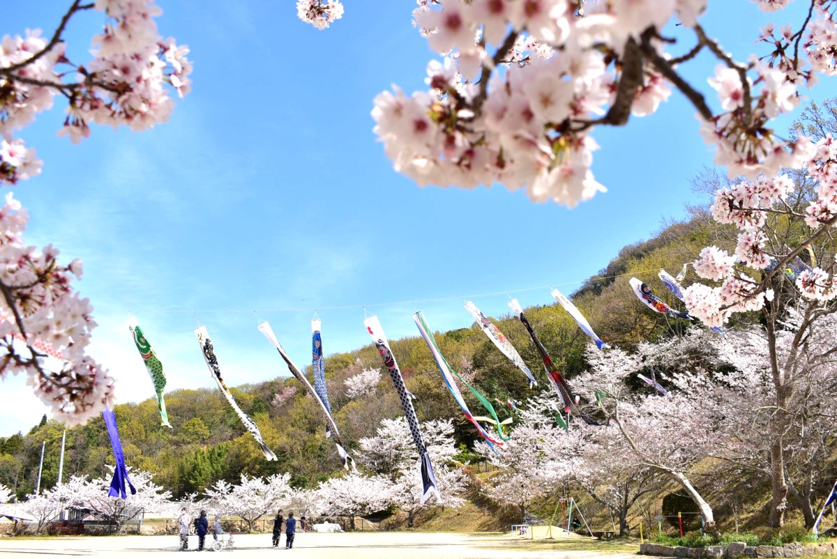 JR八浜駅~硯井の井戸方面へと進んでいくと、桜満開の公園が!しかも園内には沢山の鯉のぼりが、楽しそうに泳いでいます。毎年4~5月頃、50匹ほどの鯉のぼりが飾られるんだとか。遊具に、丸太デザインのかわいいトイレ。そして宇野線の列車も眺められる、地元で人気の公園ですよ。