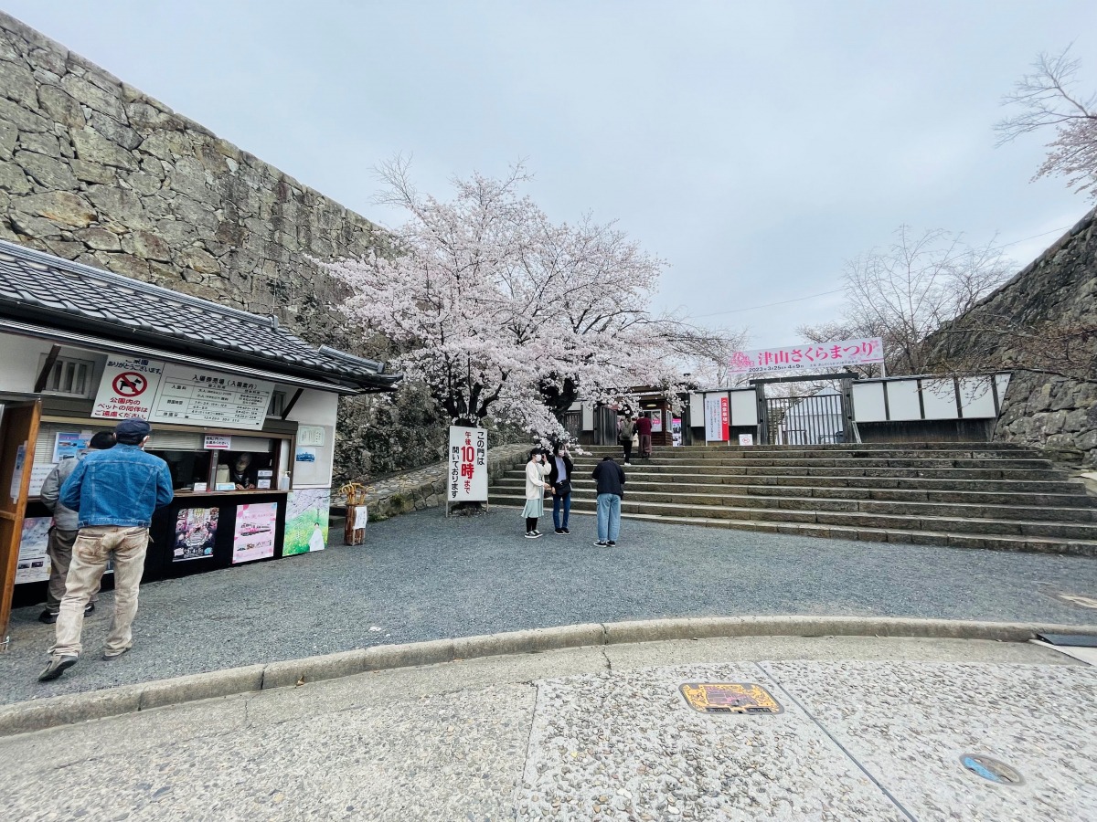 今回は、津山観光センターに車を停めることができたので、津山観光センター横の階段をのぼり、表門の方から入りました。表門までの道のりにも桜がいっぱい咲いていて、とても綺麗な桜並木と出店が続きます。