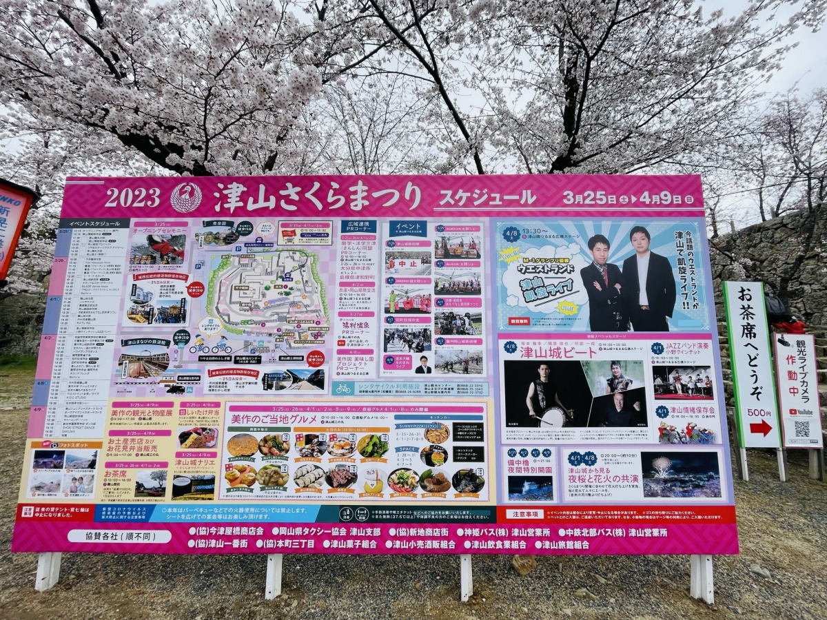入るとすぐ、津山さくらまつりの案内看板とボランティアガイドさんの待機場がありました。