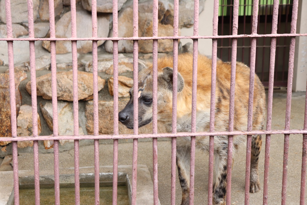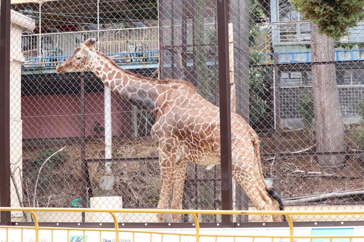ひときわ存在感を放つアミメキリンのサンタロウくん。この日は、柵内の木をなぎ倒して大暴れしていました(笑)。立ち姿のサンタロウくんを撮るために頑張ってみましたが、木を食いちぎるのに一生懸命でした。餌やり体験でニンジンが投入された時だけひと休みのサンタロウくんでした(笑)。愛嬌満点です!