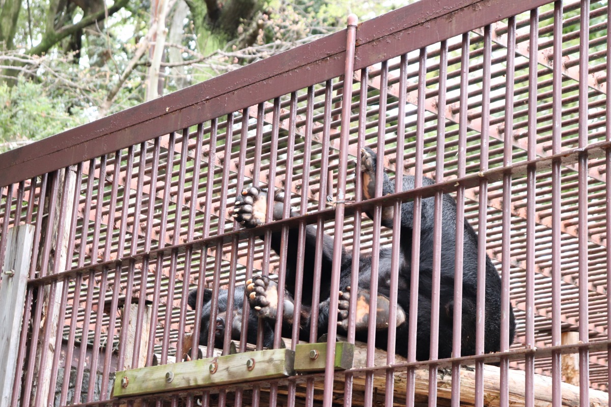 おりの柵から大きな肉球が飛び出していて、クマが寝ていました。