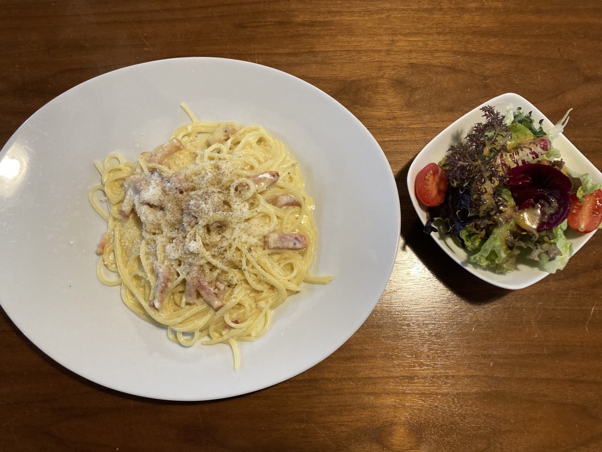 こちらで今回いただいたのは、期間限定の「美味しい卵を使ったベーコンのカルボナーラパスタ(サラダ付)」。