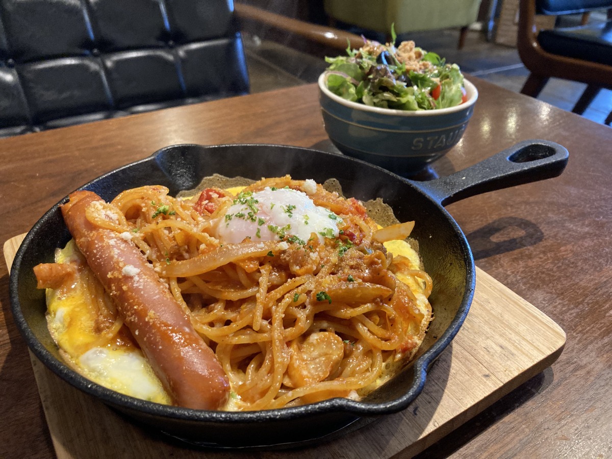 アツアツの鉄板に乗ったナポリタン!その上には温玉とウィンナーもオンされています!
