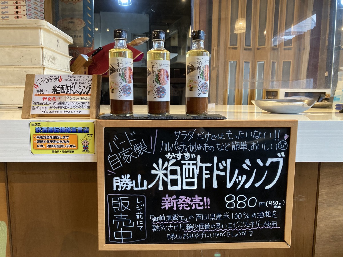 ドレッシングは、勝山の有名な酒蔵「御膳酒蔵元 辻本店」の熟成した酒粕を使った稀少価値の高い「粕酢ドレッシング」。