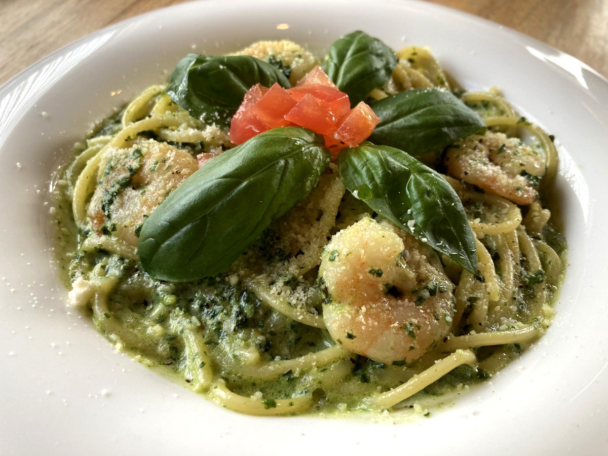 「エビとバジルのクリームパスタ」にも、自家製ジェノベーゼソースが使われています。
