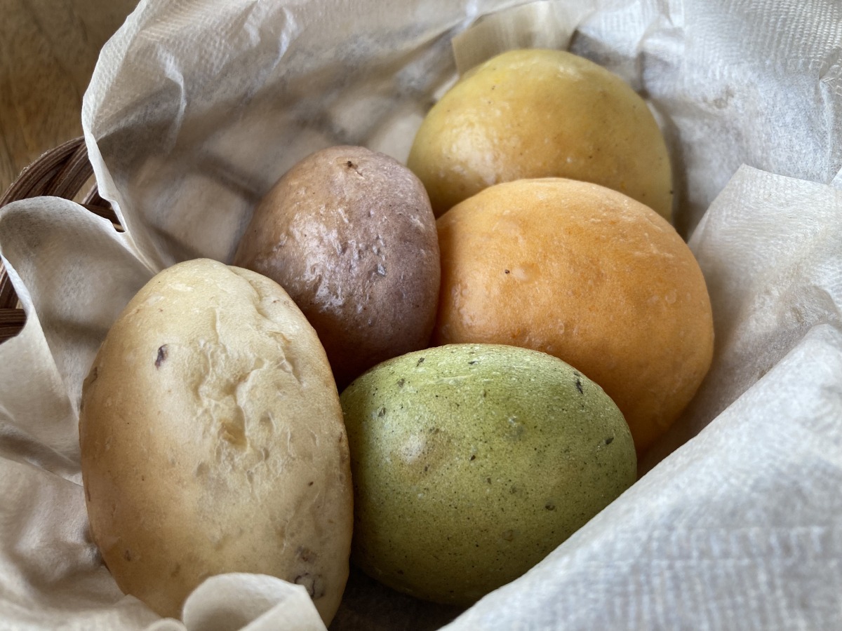 一緒にいただいたのはレーズン、バジル、紫芋、トマト、カボチャの風味の自家製パン。