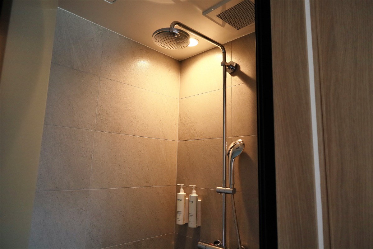 浴室は頭上から雨のように降り注ぐレインシャワータイプになっています。全身にお湯を浴びることができるので、身体全体が温まるのも魅力。普通のハンドシャワーも付いています。