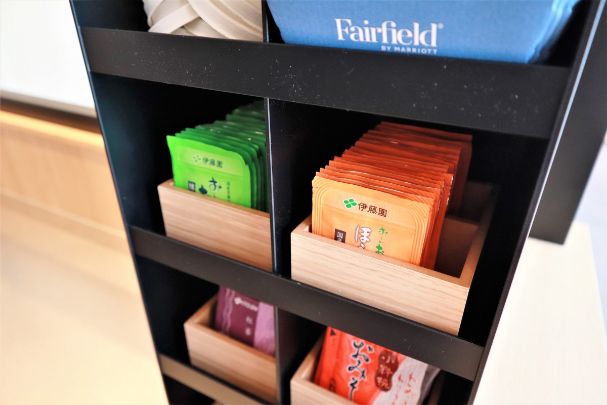 キッチンには嬉しいフリードリンクコーナーが。お茶、紅茶、お味噌汁のほか、豆から挽く珈琲もあります。挽きたて淹れたての珈琲を部屋に持ち帰ってもOK。
