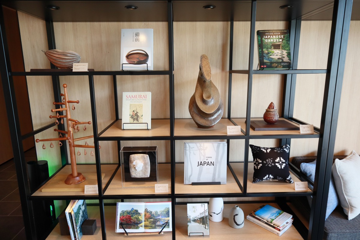 岡山県指定の郷土伝統的工芸品である作州絣のクッションや、津山の桜をイメージした木工作品、美作市のガラス作家の作品など、土地にちなんだ工芸品が展示されたライブラリー。